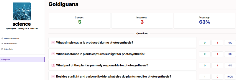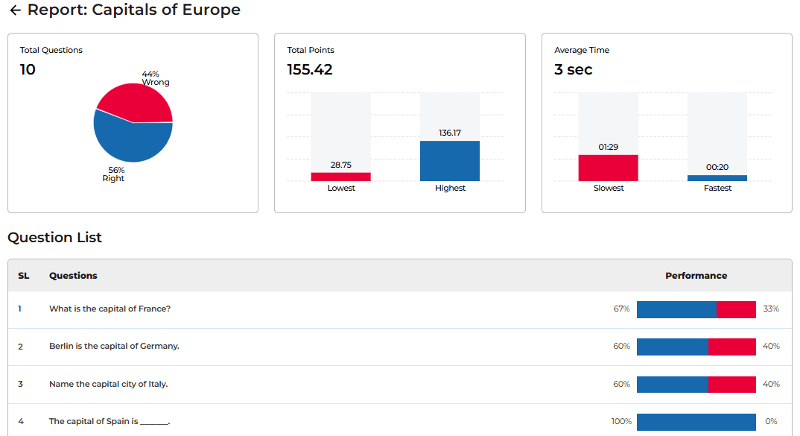 Lastly, Tarphi’s reporting isn’t just a scoreboard; it’s built like a lightweight analytics layer for your classroom. You can see class performance, question-by-question accuracy, right/wrong percentage, fastest and slowest responses.